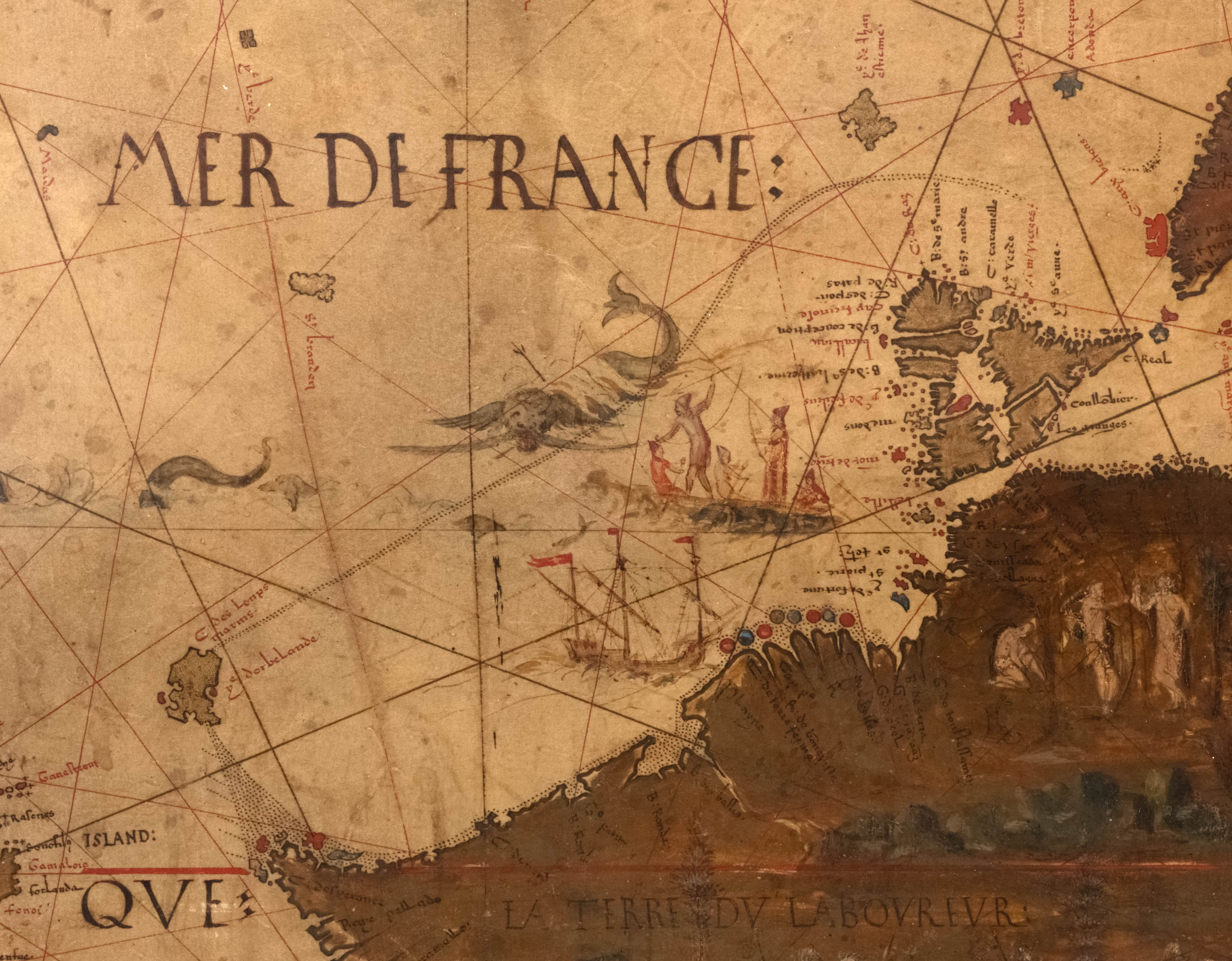 Detail of Pierre Desceliers 1546 map of the world showing Labourdian whalers with what appears to be an Innu whaler aboard