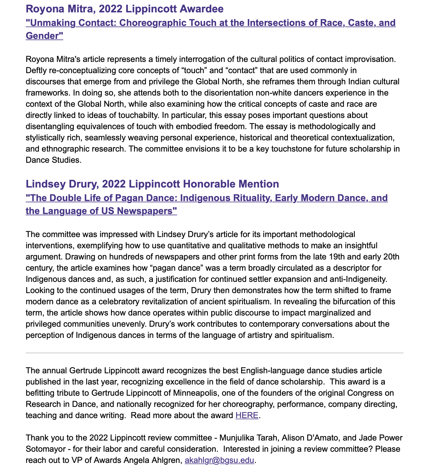 The 2022 Gertrude Lippincott Award was won by Royona Mitra, for her important article “Unmaking Contact: Choreographic Touch at the Intersections of Race, Caste, and Gender” (Dance Research Journal, 2021).